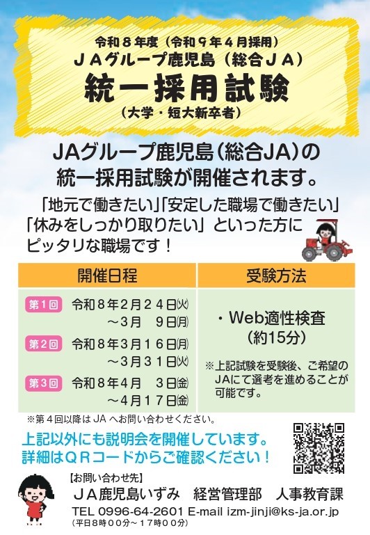 令和8年度(令和9年4月採用)JAグループ鹿児島統一採用試験のご案内について